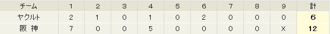 阪神が初回に7打数連続安打で一挙7点を奪うなど12安打12得点でヤクルトに打ち勝ち、引き分けを挟んだ連敗を5で止めた。