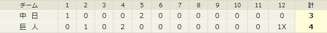 中日は初回、先頭・大島の左翼線二塁打から2死三塁とし平田の右前打で1点を先制。逆転され2点を追う5回には、荒木、ルナの連打で1死一、二塁から平田の中前適時打と森野の右越え適時打で追いついた。だが、6回以降は打線がつながらず、延長12回に6番手・伊藤が力尽き、チームは4連敗。