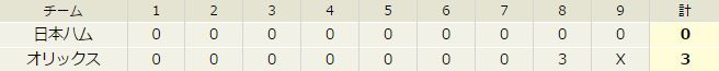 日本ハムは2回の無死一塁、3回の1死一塁、5回の1死一塁でいずれも打者が併殺打に終わるなど先制機をものにできず、6回から7回にかけては1番から5番打者までが5者連続三振に終わるなどオリックスの3投手に散発4安打に終わった。