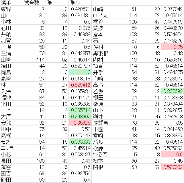 今年の横浜で一軍にいた選手のうち、その選手の成績関係なくチームの勝率がいい選手『幸運の置物』は誰かを検証していきます。